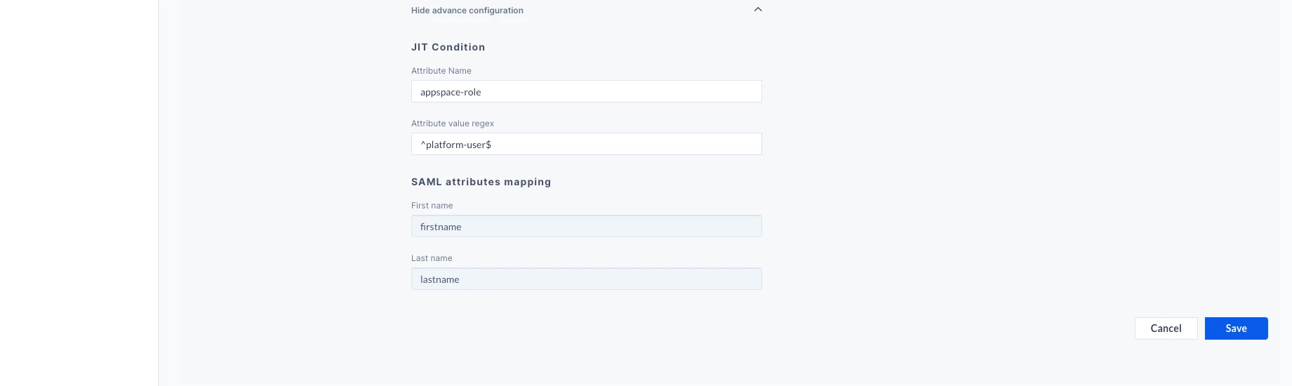 This allows you to only provision platform users for some employees, while allowing for pass-through access. By default, this looks for an attribute called “appspace-role” with a value of “platform-user$”, however this is designed to be flexible and has a regex match. You could also make it match all users by setting it to something like attribute = ‘mail’ value = ‘.*’ (regex wildcard that will match any email value). - Enter in the SAML attributes mapping for the First name and Last name.