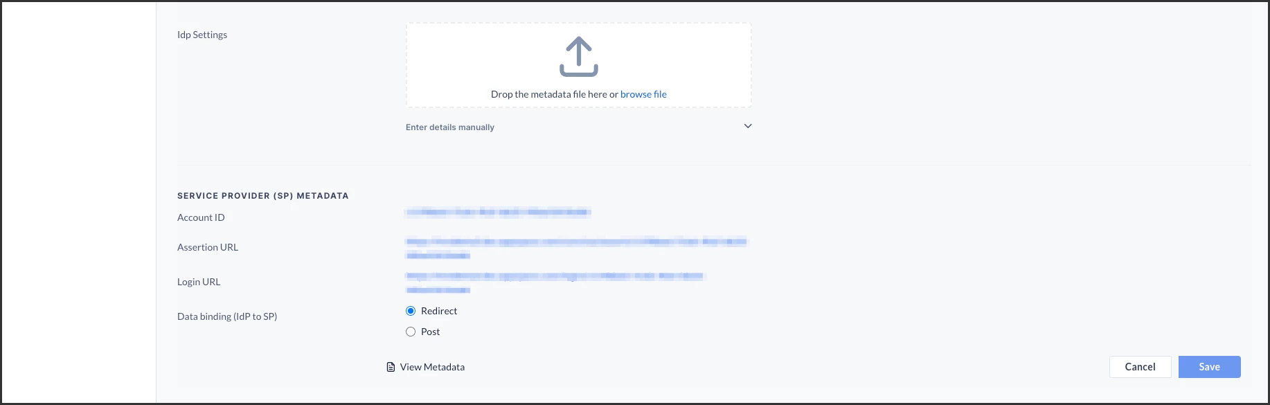 - In the SERVICE PROVIDER (SP) METADATA section, select the desired Data binding (IdP to SP) option: