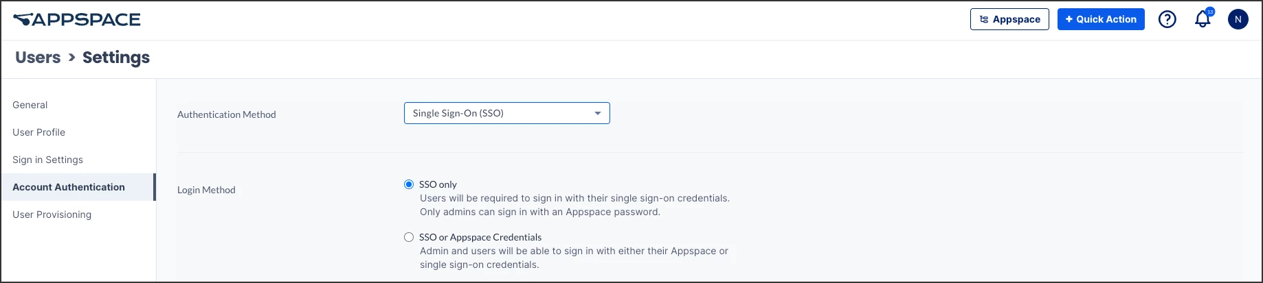 - SSO only – Users will be required to sign in with their single sign-on credentials. Only Account Owners can sign in with an Appspace password.