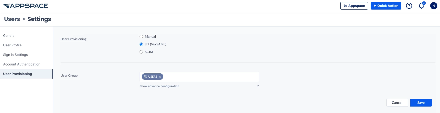 Just-In-Time Provisioning allows you to enable the automatic creation of users on the Appspace account if they do not exist.