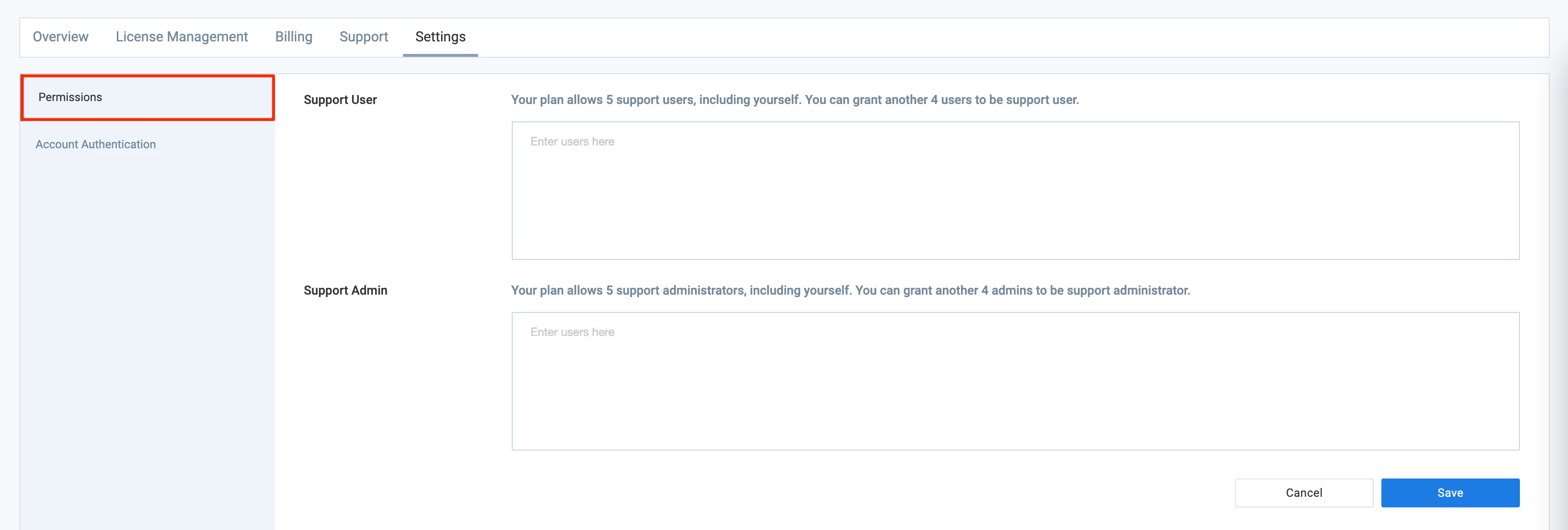 The total number of users you may assign Support portal permissions are shared between the Support User and Support Admin permissions, and are based on your Appspace OMNI subscription plans.