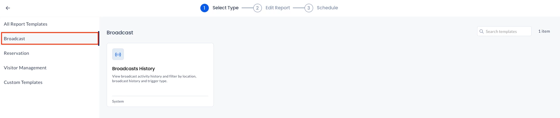 - In the Select Type step, search and select the desired Broadcast Report Template available.