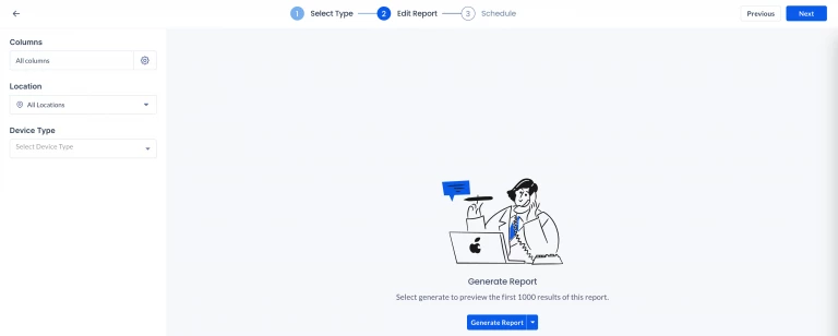 - In the Edit Report step, proceed to configure the following reporting fields from the drop-down based on the Devices report template selected: