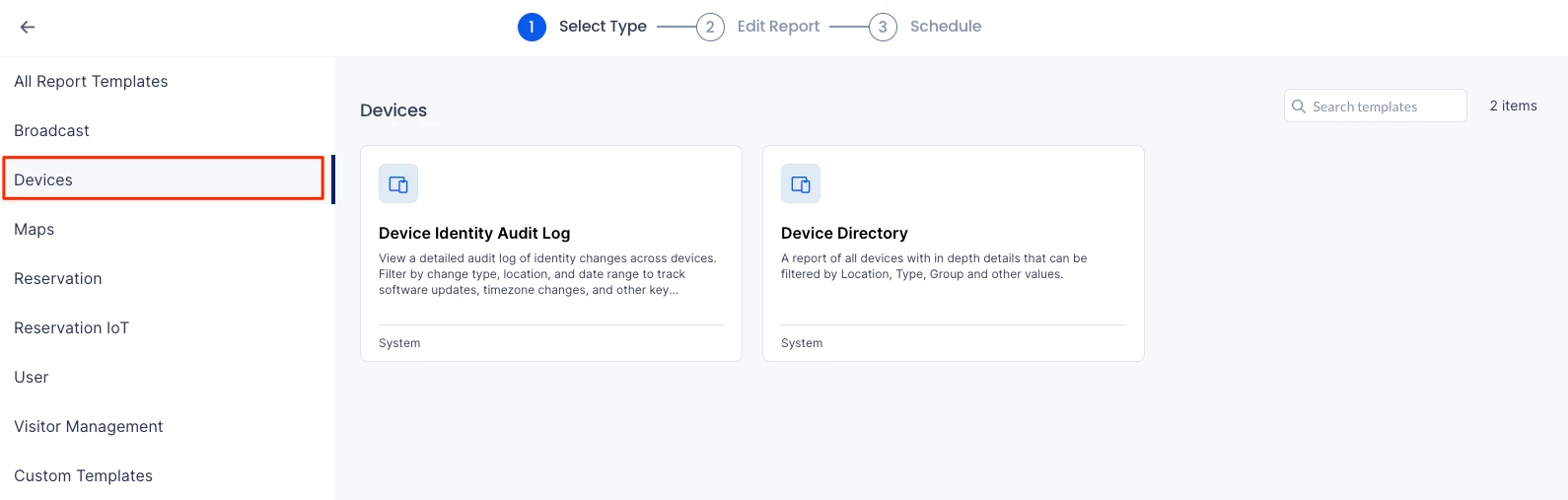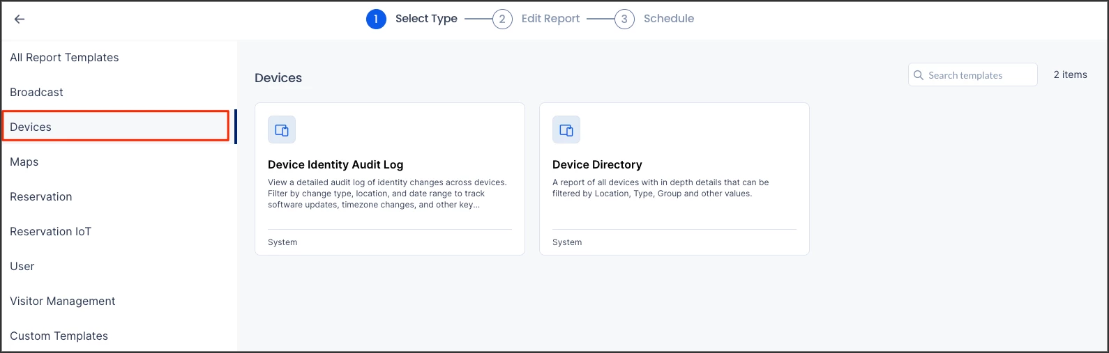 - In the Select Type step, search and select the desired Devices Report Template available.