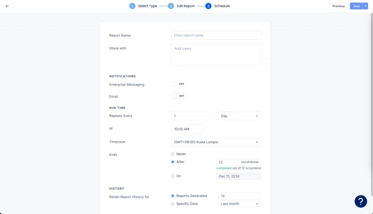 - RUN TIME – Define the report schedule run time.