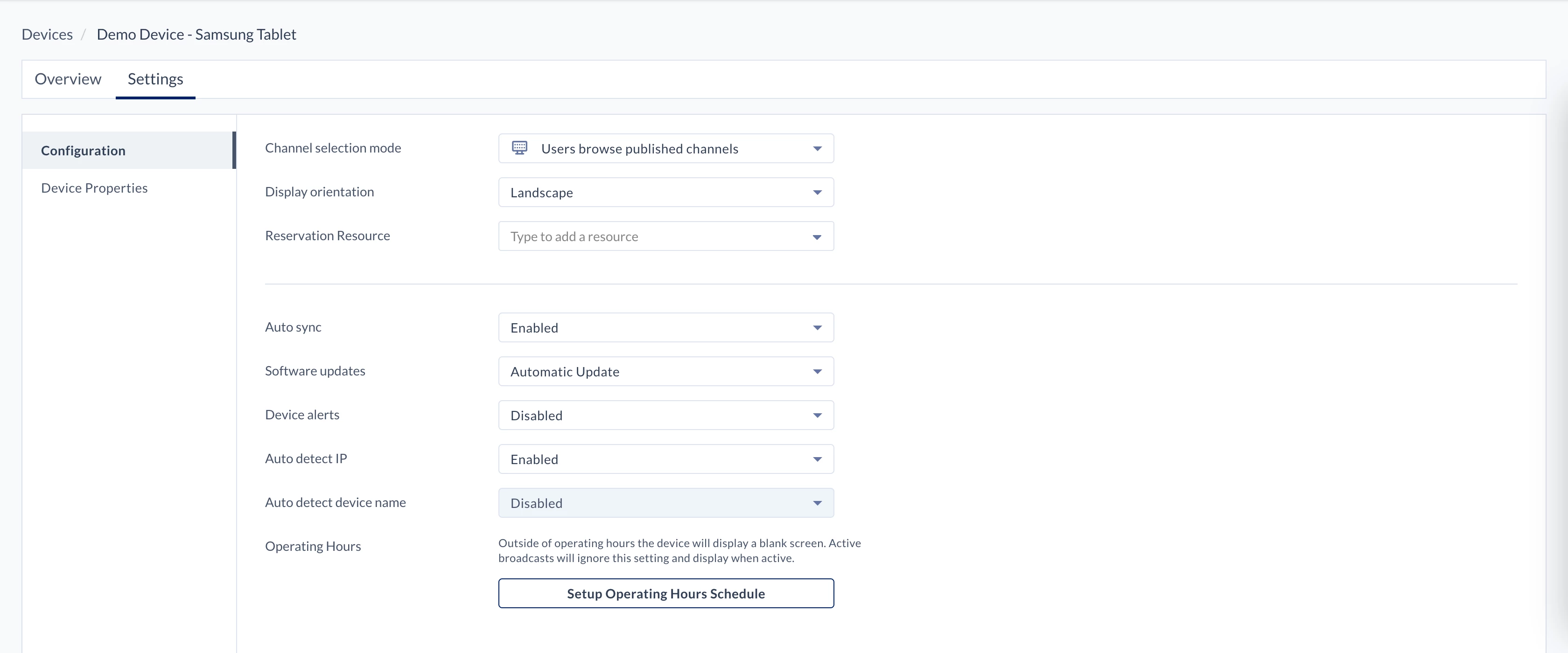 The Device Properties sub-tab here allows for non-visual settings to be configured directly to your device locally. These properties include numerous device configurations and settings such as device display rotation and kiosk mode. Administrators may also define custom device properties to be used in Event Actions in Advanced Channels (Sign).