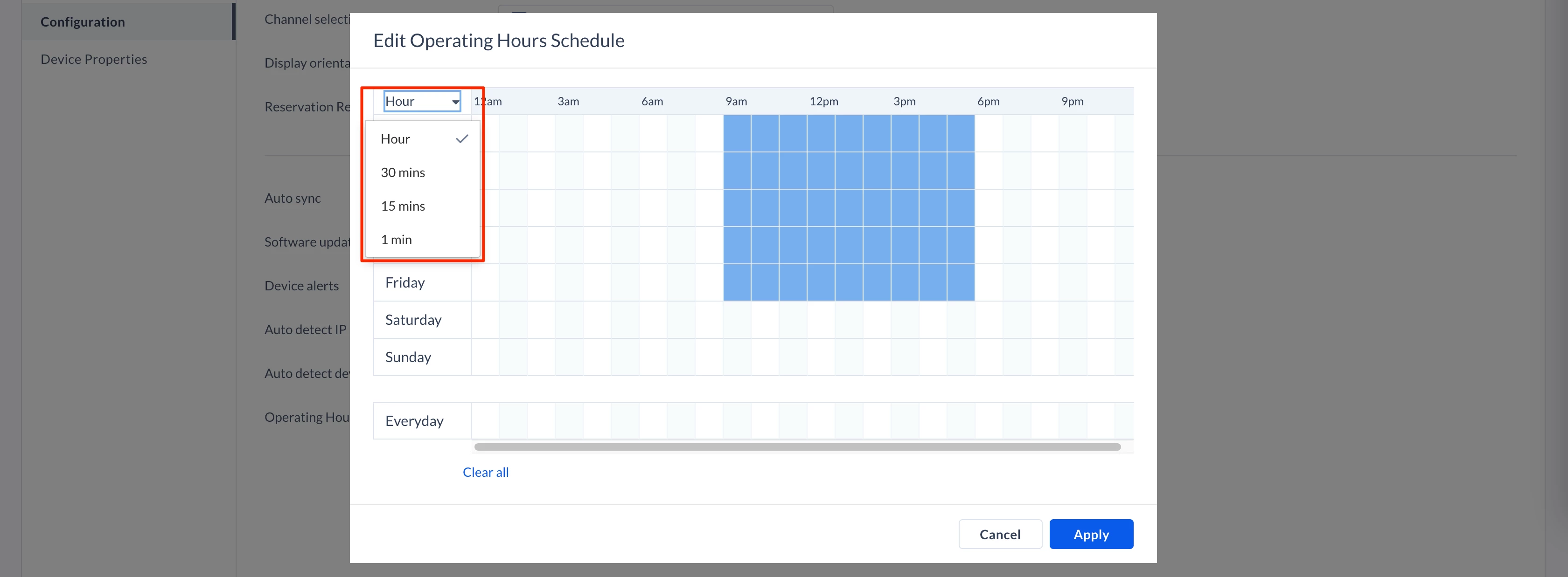 - In the Edit Operating Hours Schedule window, proceed to schedule the operating hours of the device by selecting the time slots indicated for the respective days. Each time slot duration can be set to a minimum of a minute to a maximum of an hour.