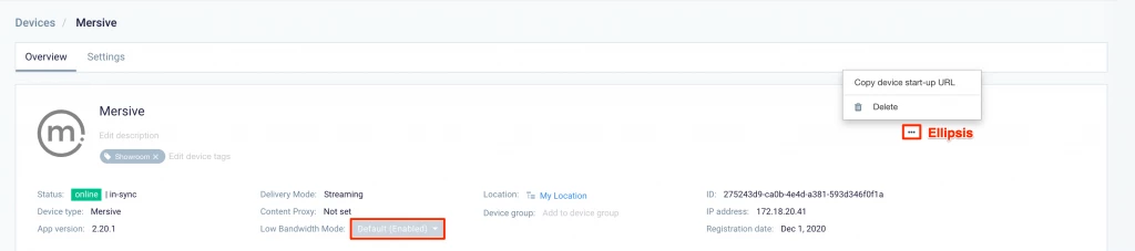 The first section of the Device Overview provides users with device details, and clicking the ellipsis allows you to obtain the device start-up URL that is used to assign pre-registered devices to physical devices. The following device details are displayed: