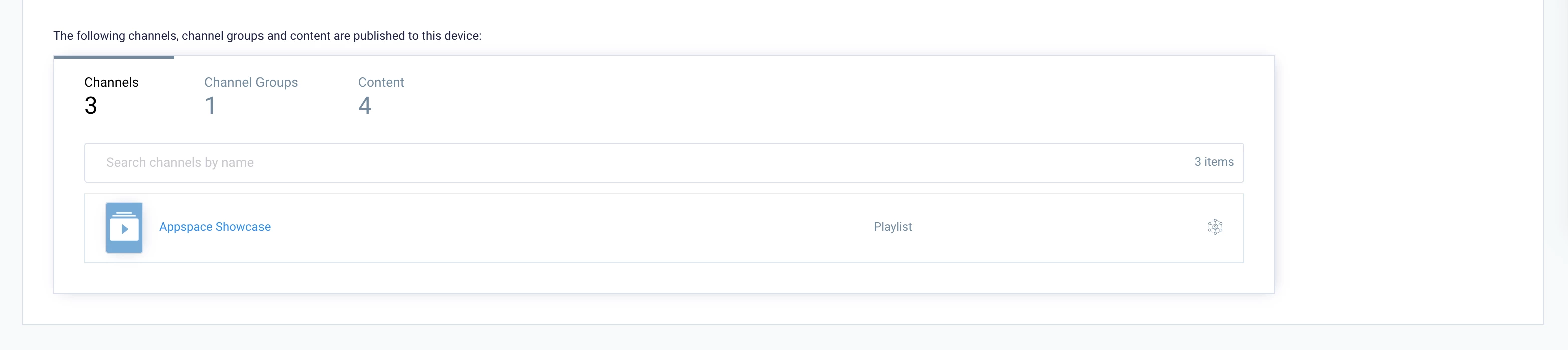 Below the preview section, there is a list of channels, channel groups, and content assigned to the device. Publishers may click on each channel to view the channel details.