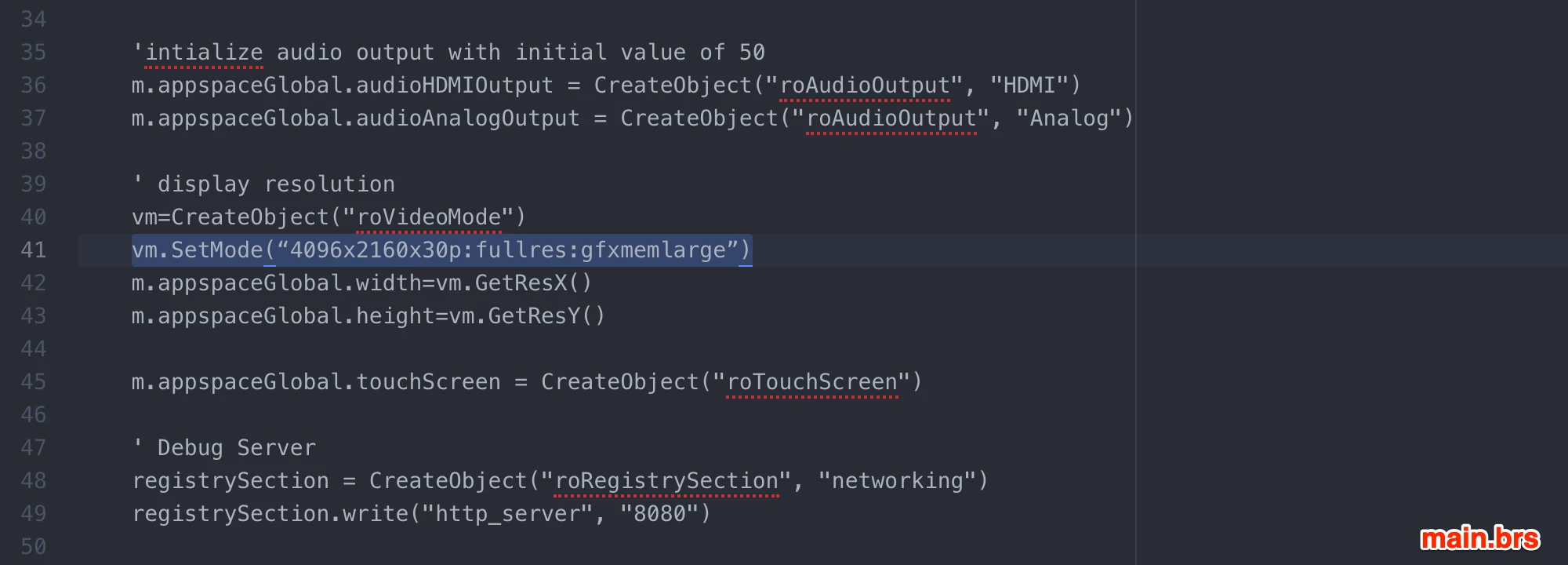 - Locate the “vmCreate Object (“roVideoMode”) line of code, and enter the vm.SetMode(“4096x2160x30p:fullres:gfxmemlarge”) line of code below it.