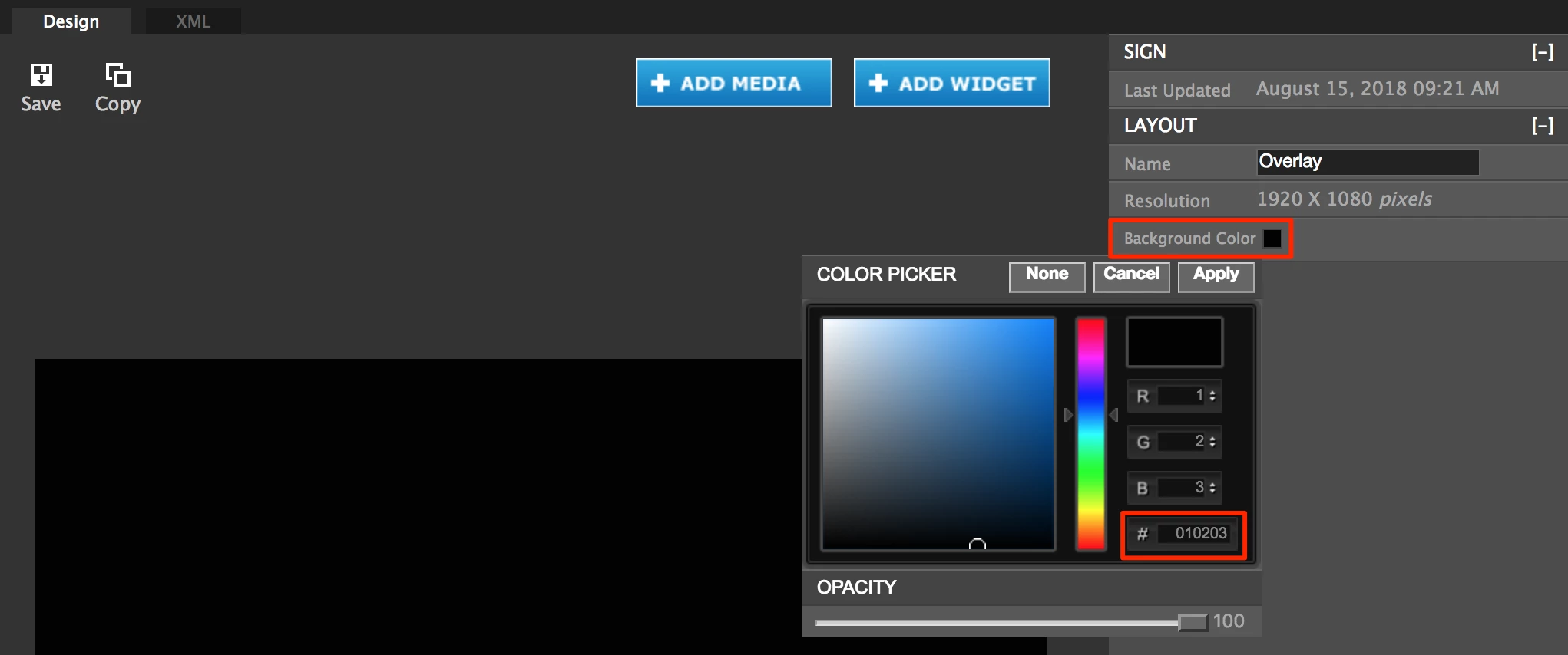 - Back on the editing window, change the layout Background Color to #010203 with the OPACITY of 100, or edit the following widget property: