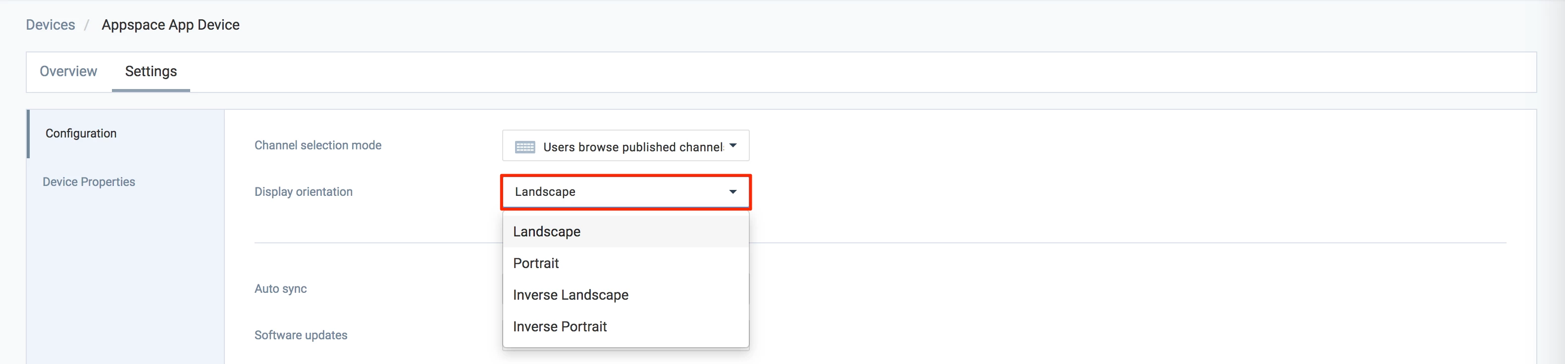 In Appspace 7.0 and later, a single playlist channel automatically rotates based on the natural orientation of the device. However, BrightSign by default, does not have a device orientation setting to support this feature, and instead follows the current, or the last orientation setting of a device.