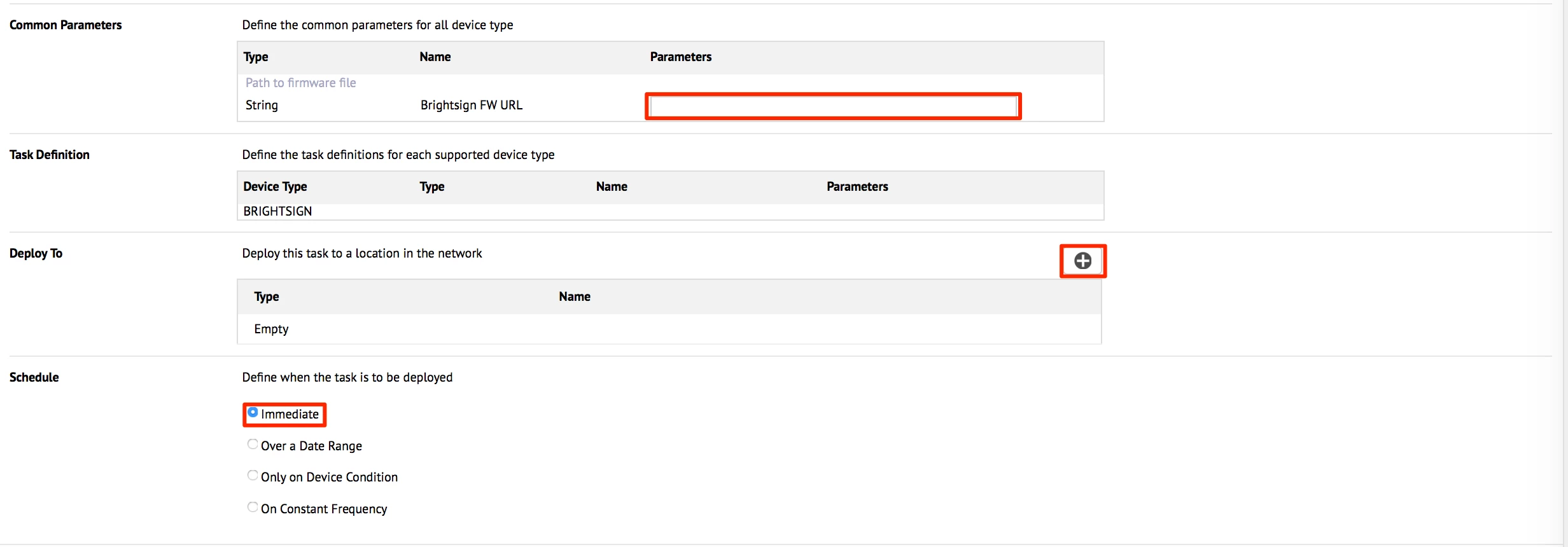 - In the Common Parameters section, enter in the URL to the BrightSign firmware package on your local web server (from Step 3 above).