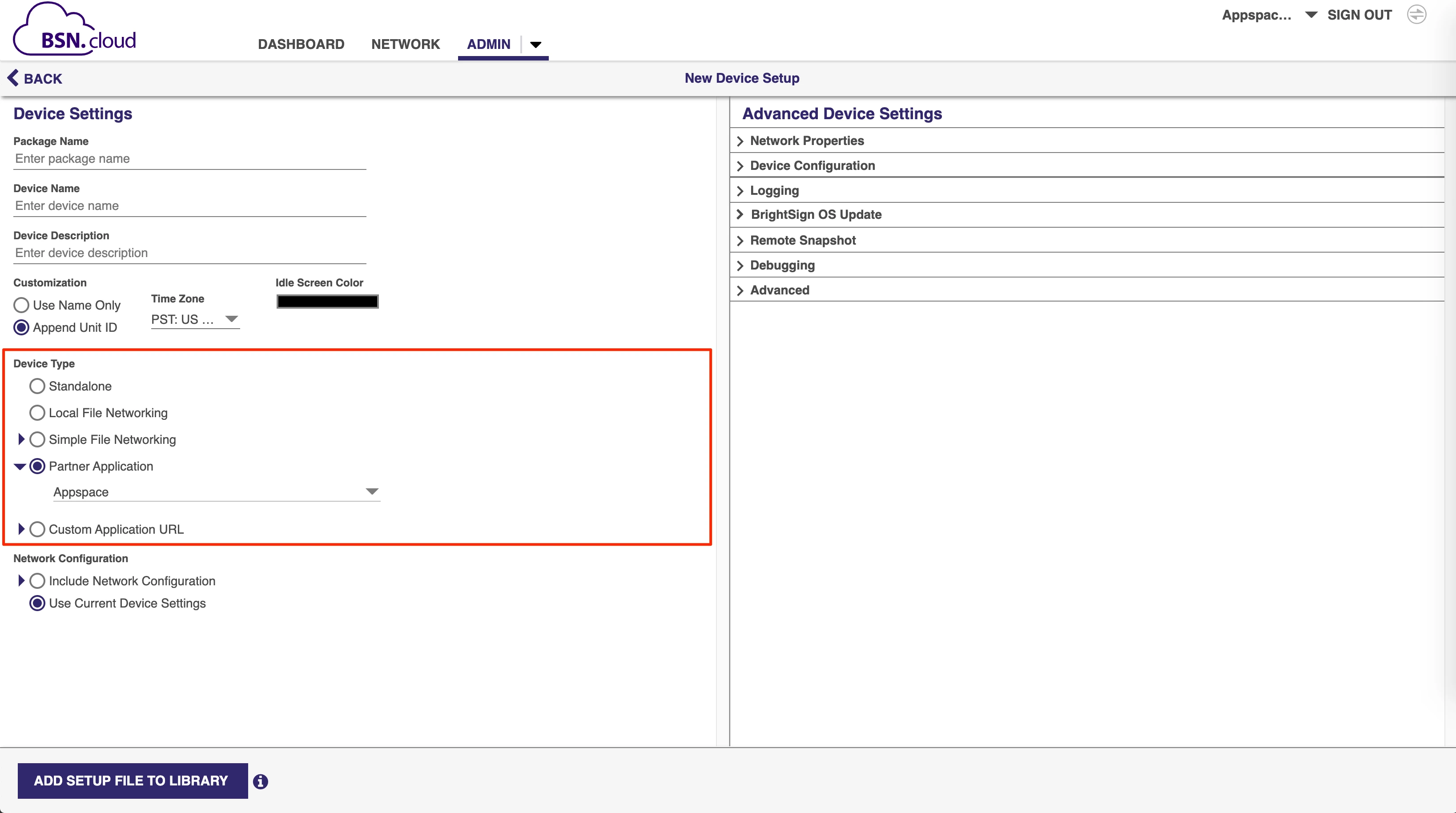 - In Step 6, select Partner Application as the Device Type, and select Appspace from the drop-down menu.