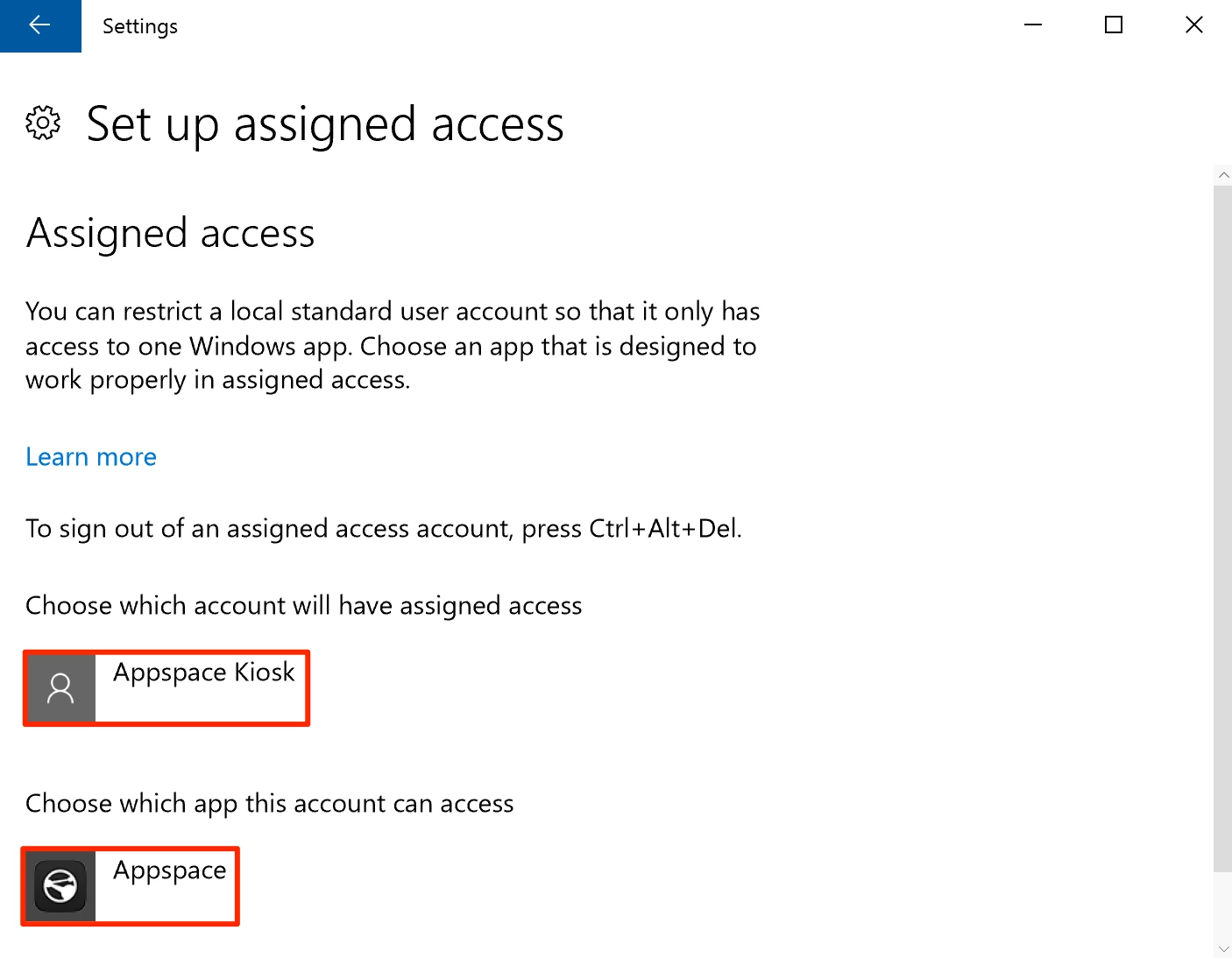 Select the kiosk account, and Appspace App when selecting an account and app for Assigned access.