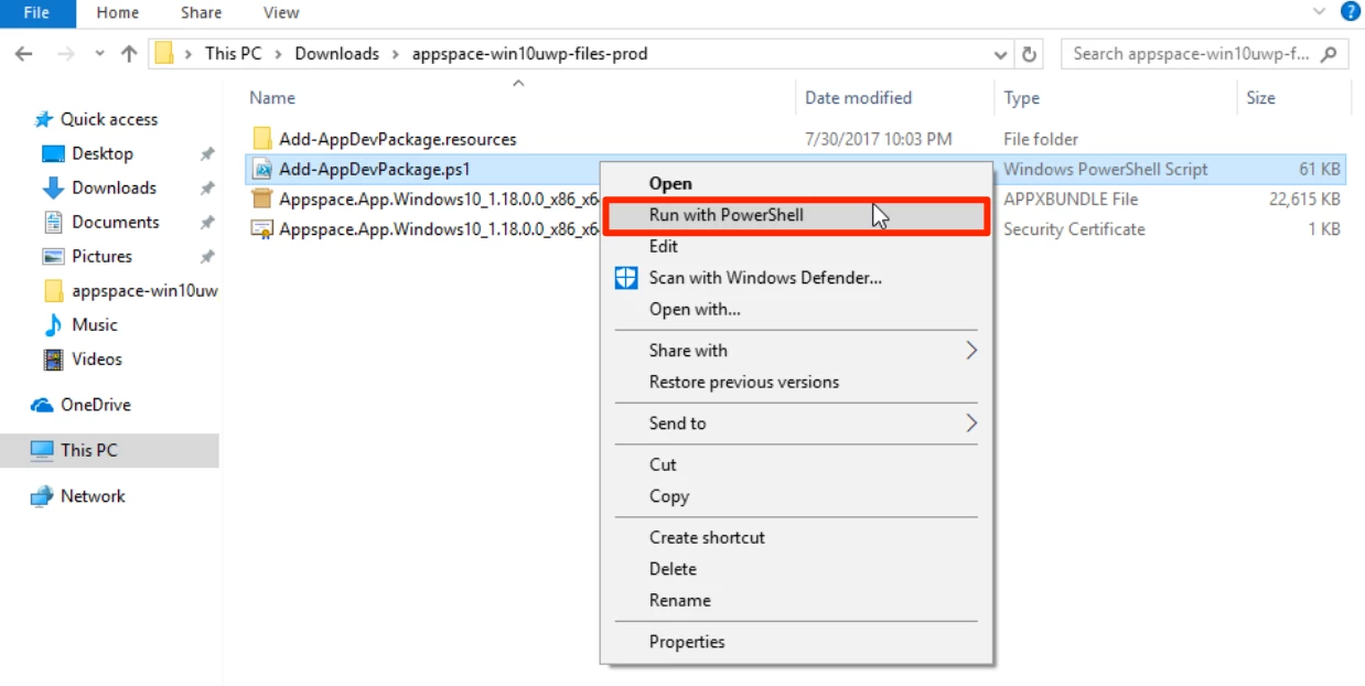 3. Right-click the Add-AppDevPackage.ps1 file, and select Run with PowerShell.