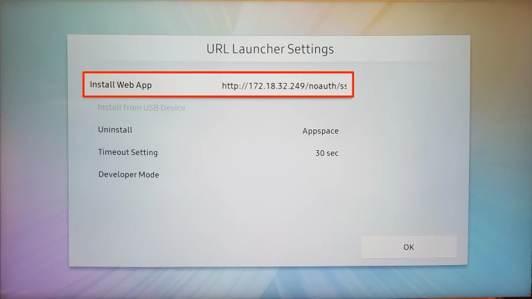 - In the URL Launcher Settings window, enter the following URL in the Install Web App field, and click OK.Install Web App : https://cloud.appspace.com/device/tizen