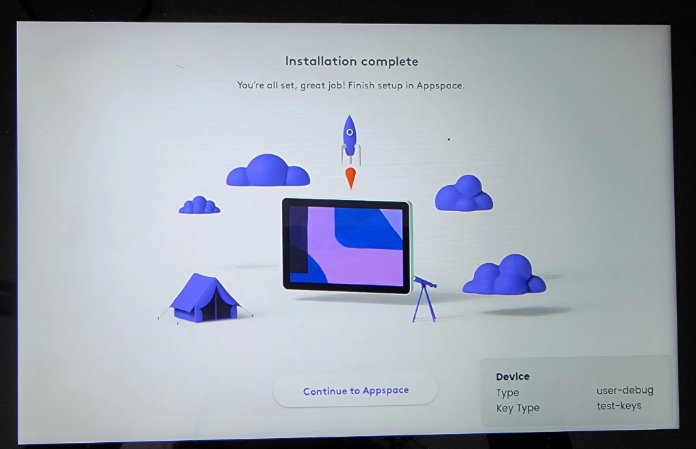 - Once the installation has completed, click Continue to Appspace to launch the Appspace App (Devices) registration screen.