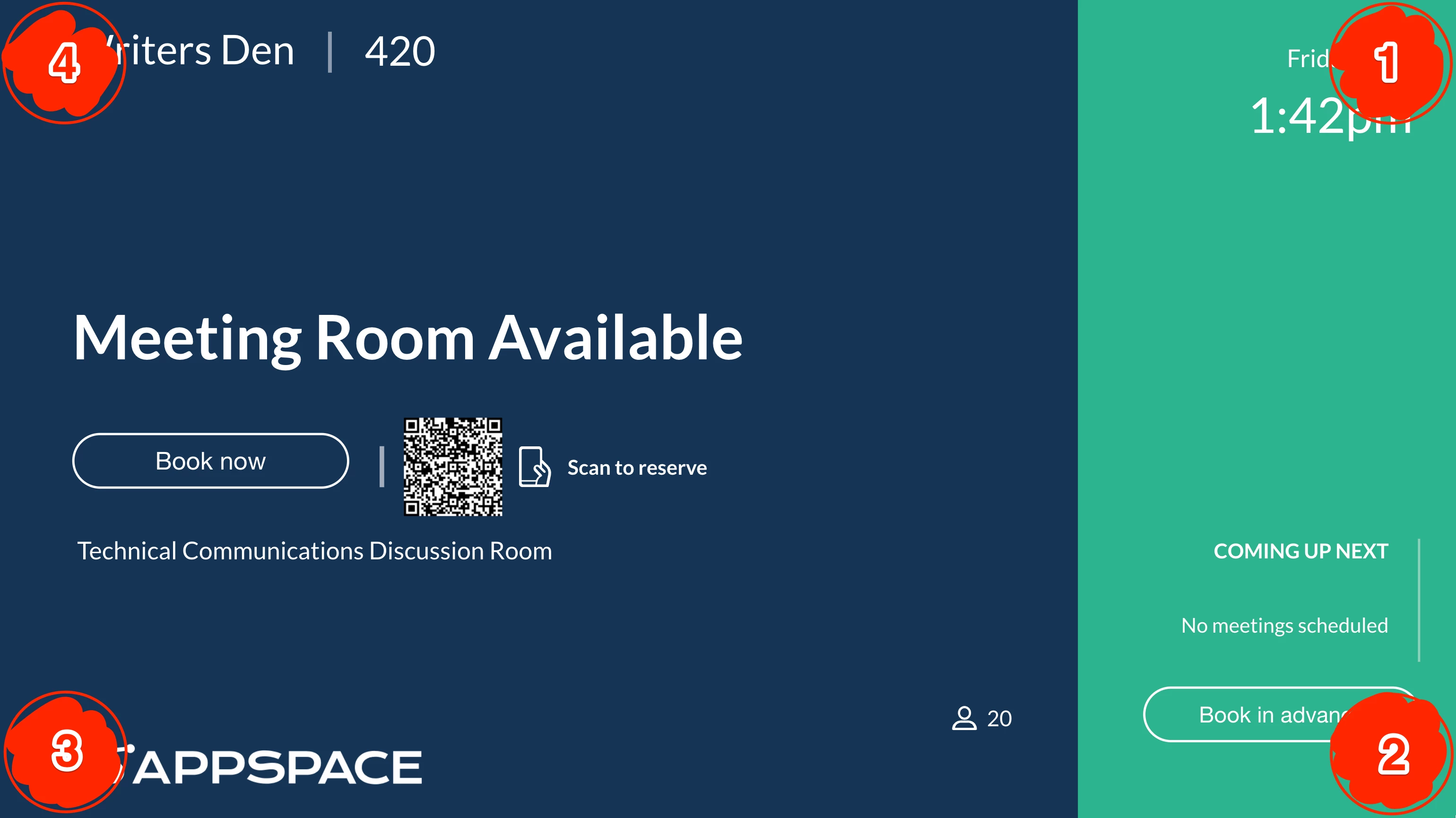 - The Appspace room scheduling service will be displayed on the device, ready for room booking.