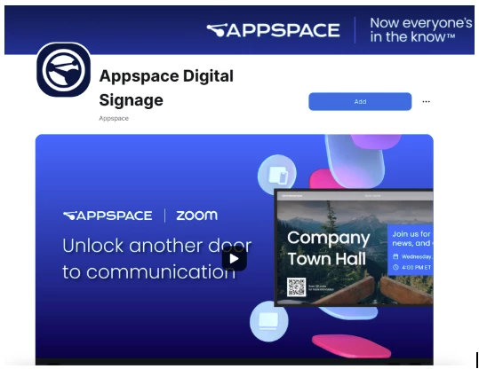 - Click on Zoom Rooms. A new tab will open, displaying the Appspace Digital Signage page in the Zoom Marketplace with a blue Add button.