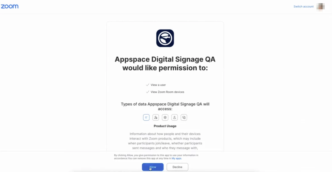 Before beginning this process, ensure the user logged into the Appspace Admin View has the Account Owner role. This is mandatory for successful authorization with the Zoom Marketplace.