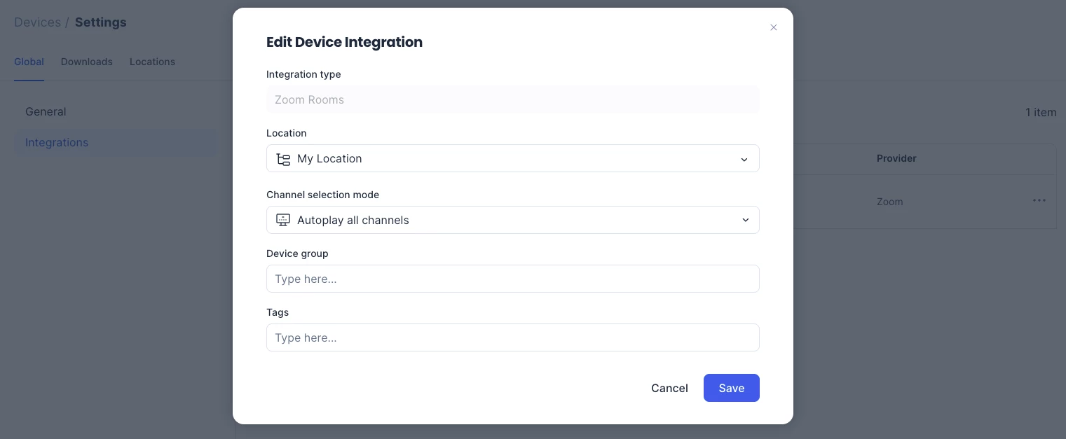 - In the Devices > Integrations tab, Zoom Rooms now will be listed on the integrations dashboard.