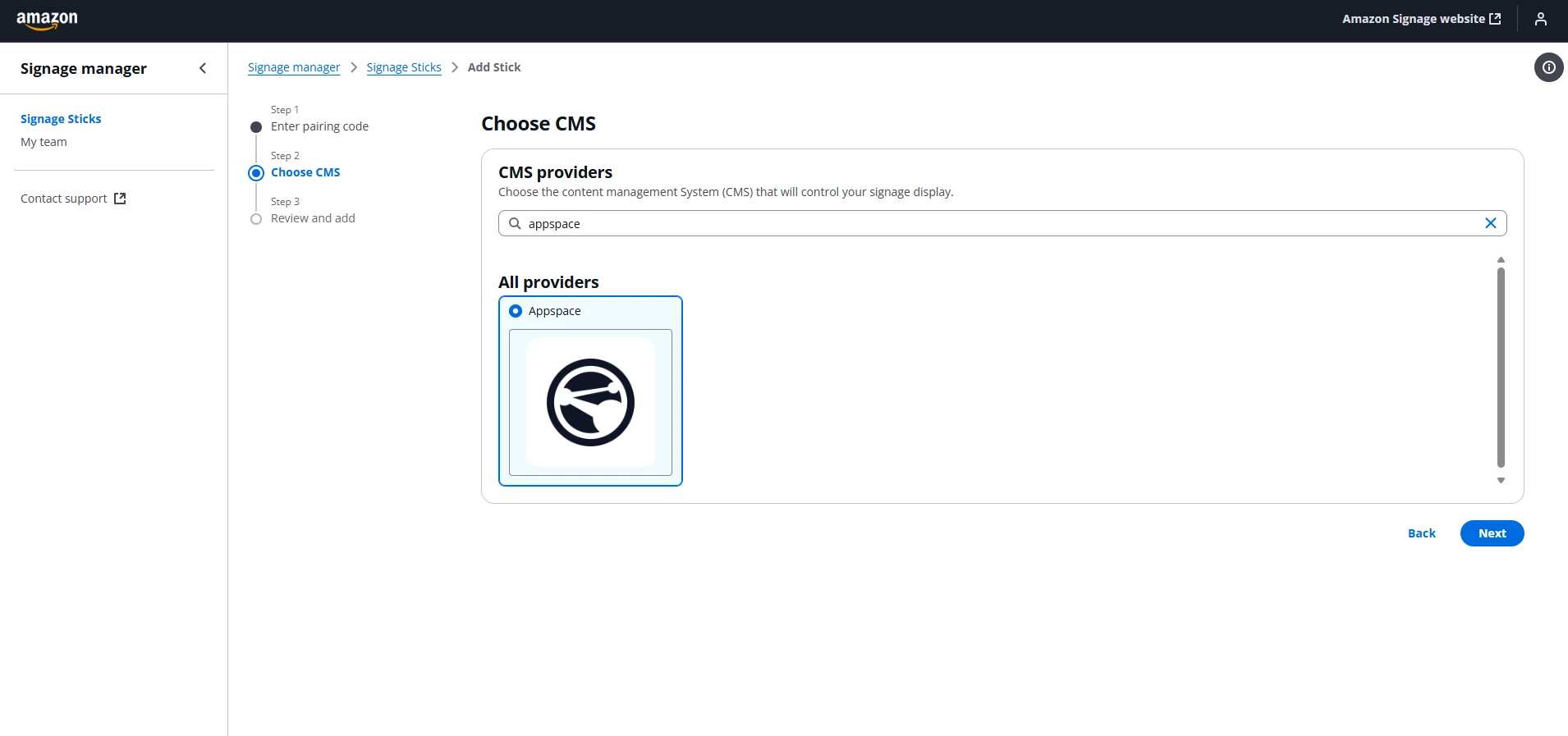 - Select Appspace as the Content Management System provider.