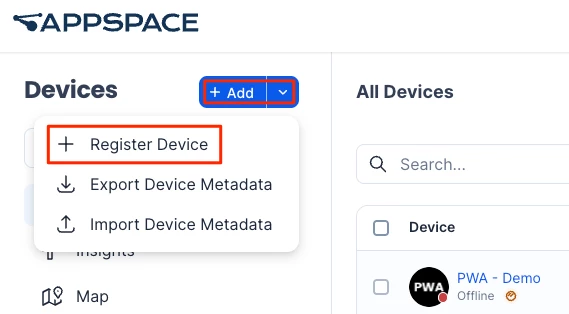 - Click +Add > + Register Device.