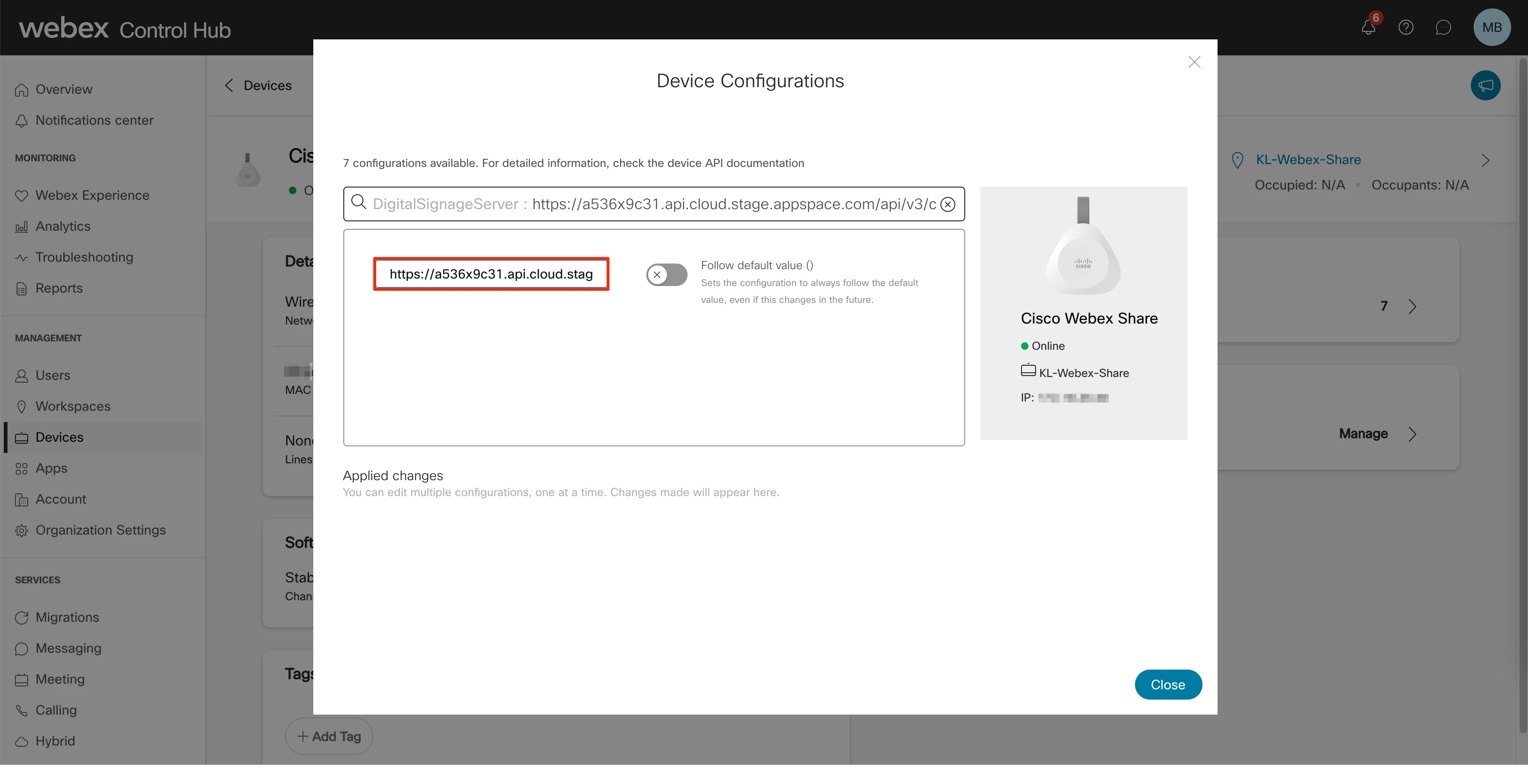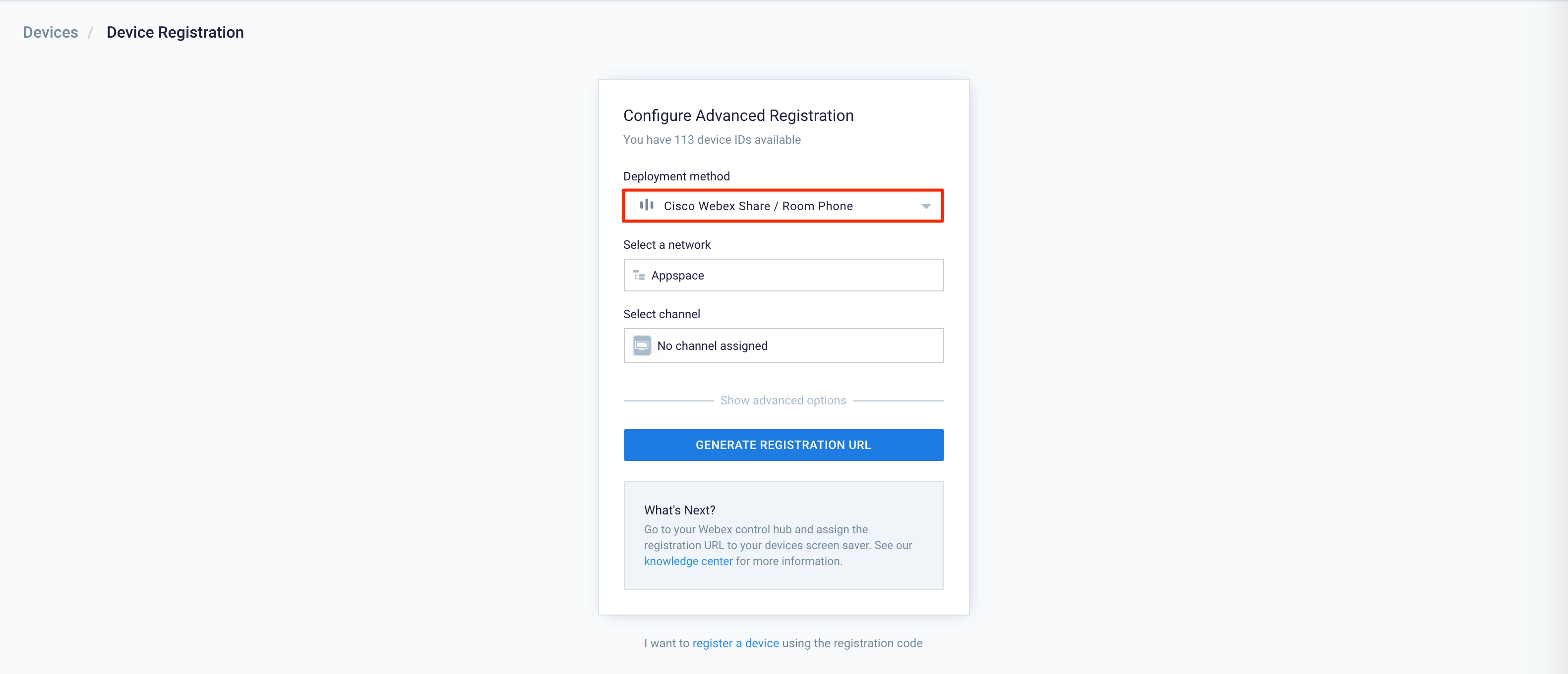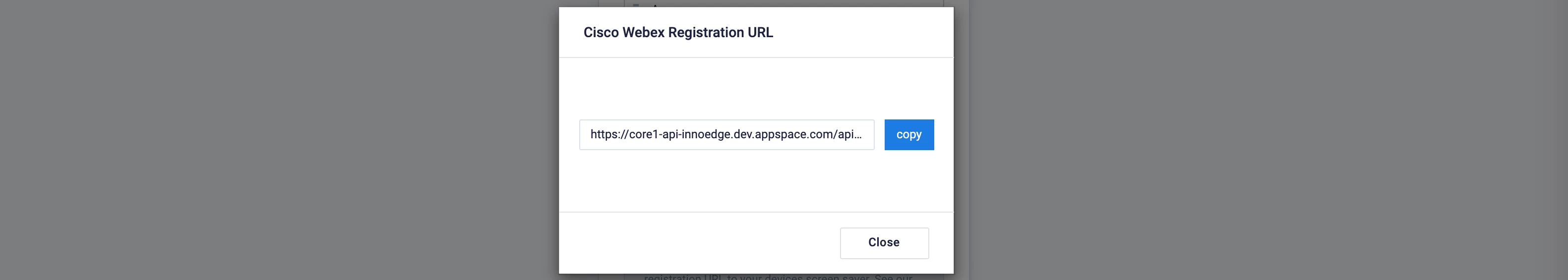 Appspace leverages Webex’s API on these devices in order to manage content while the device is in idle mode. From the Appspace console, you can generate a registration URL that is used in the Webex Control Hub to configure the device and have it register itself.
