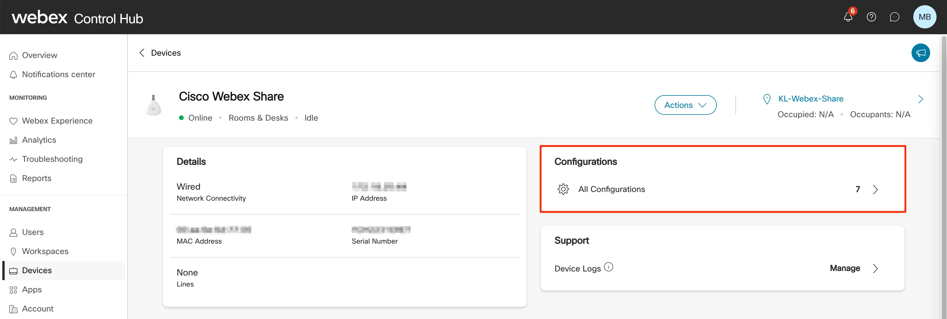- Log in to the device, and navigate to the Configurations section in the Webex Control Hub, and click Access x Configurations (number may vary depending on your Webex Control Hub setup).