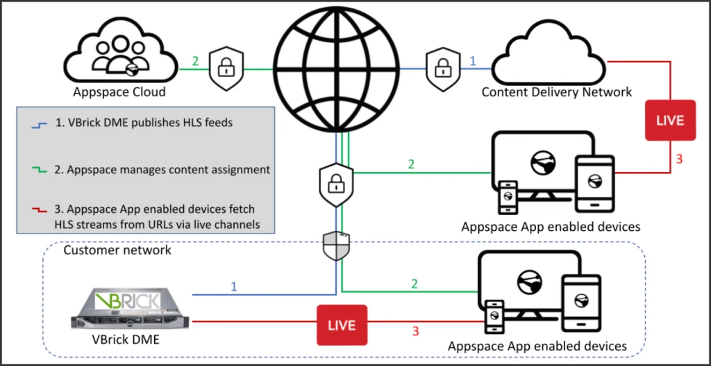 Both Appspace and Vbrick offer cloud-based and on-prem deployment scenarios. The architecture shown above assumes the two most common choices: a cloud-based Appspace deployment and an on-prem Vbrick deployment.