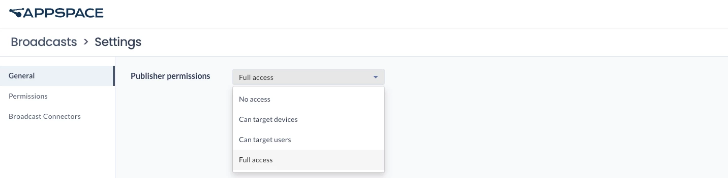 - Full access – This option allows users with the publisher role to create, update, and manage broadcasts in locations to which they have access. This is the default option, reflecting the behavior of broadcasts prior to the introduction of granular access.