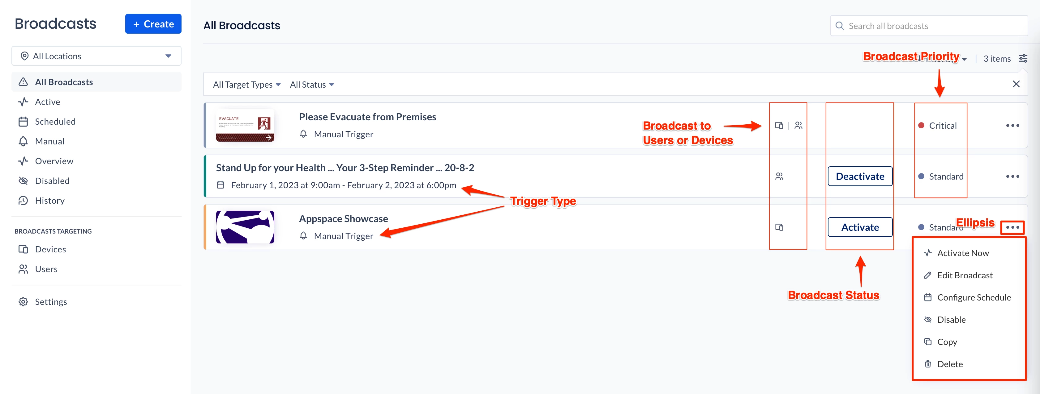This article provides administrators with an introduction to navigating the user interface and features available within the Broadcasts module in the Appspace console.