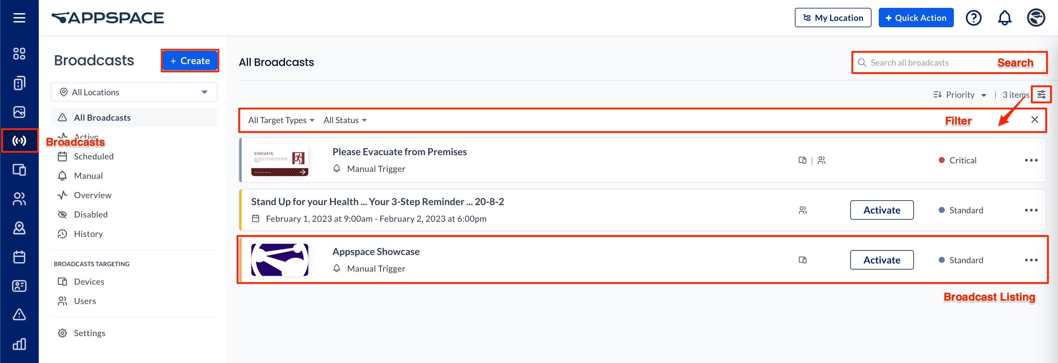 - The Broadcasts dashboard can be accessed via the ☰ Appspace menu from the Admin console sidebar. Here, you’ll be able to view, create, and manage broadcasts within the Appspace console.