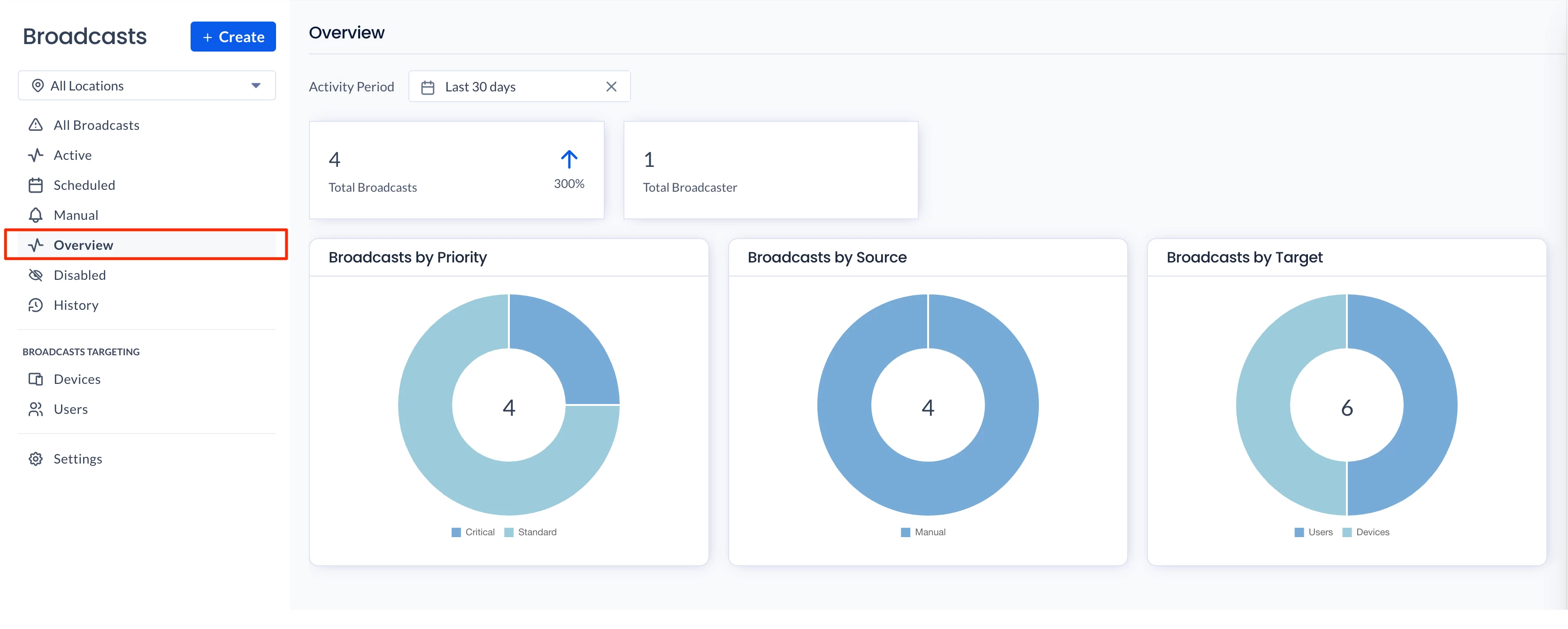 - The Create + button on the dashboard allows administrators to quickly create a broadcast.