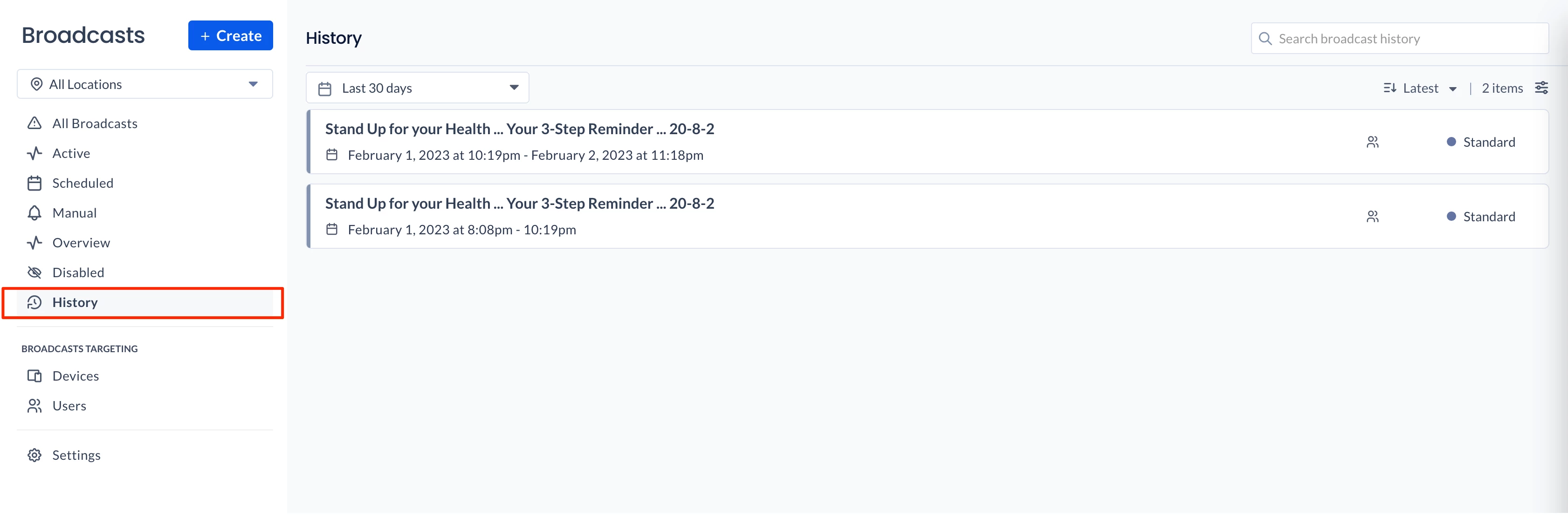 History displays a historical view of all broadcast events that have been activated, including broadcasts runtime, trigger details, and targets in the Last 30 days (default) or a specific duration that is selected from the calendar.