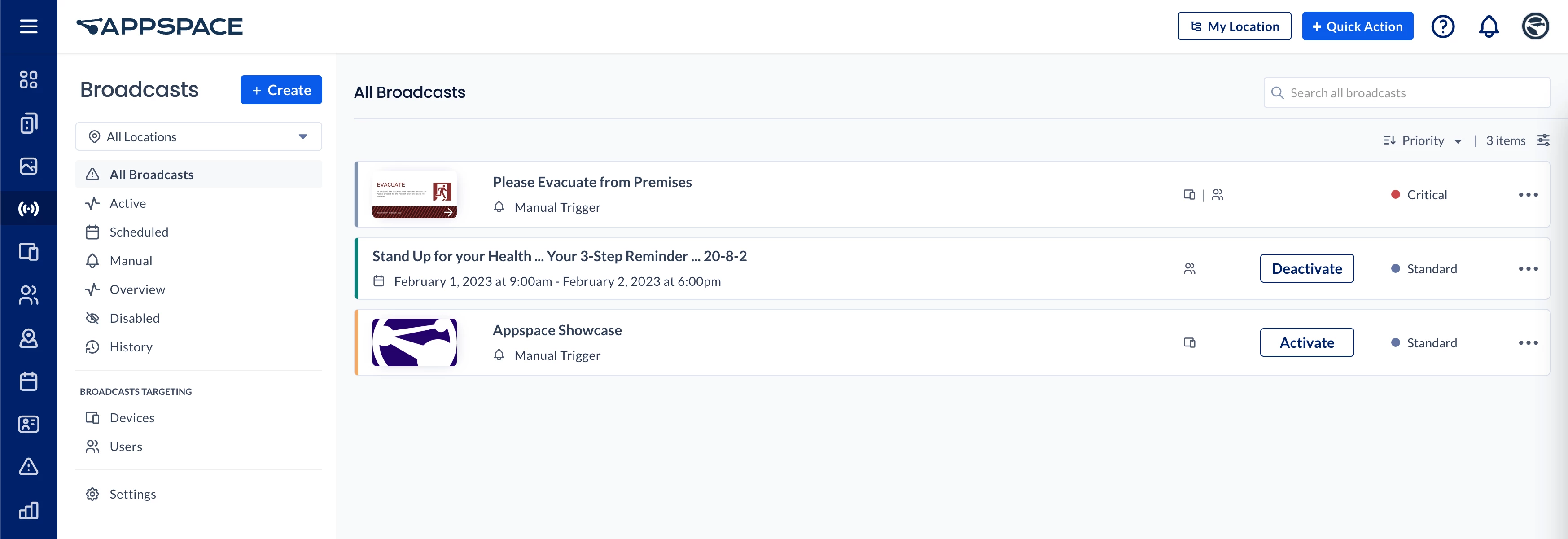 Follow the instructions below to manually activate or deactivate broadcasts via the Appspace console.