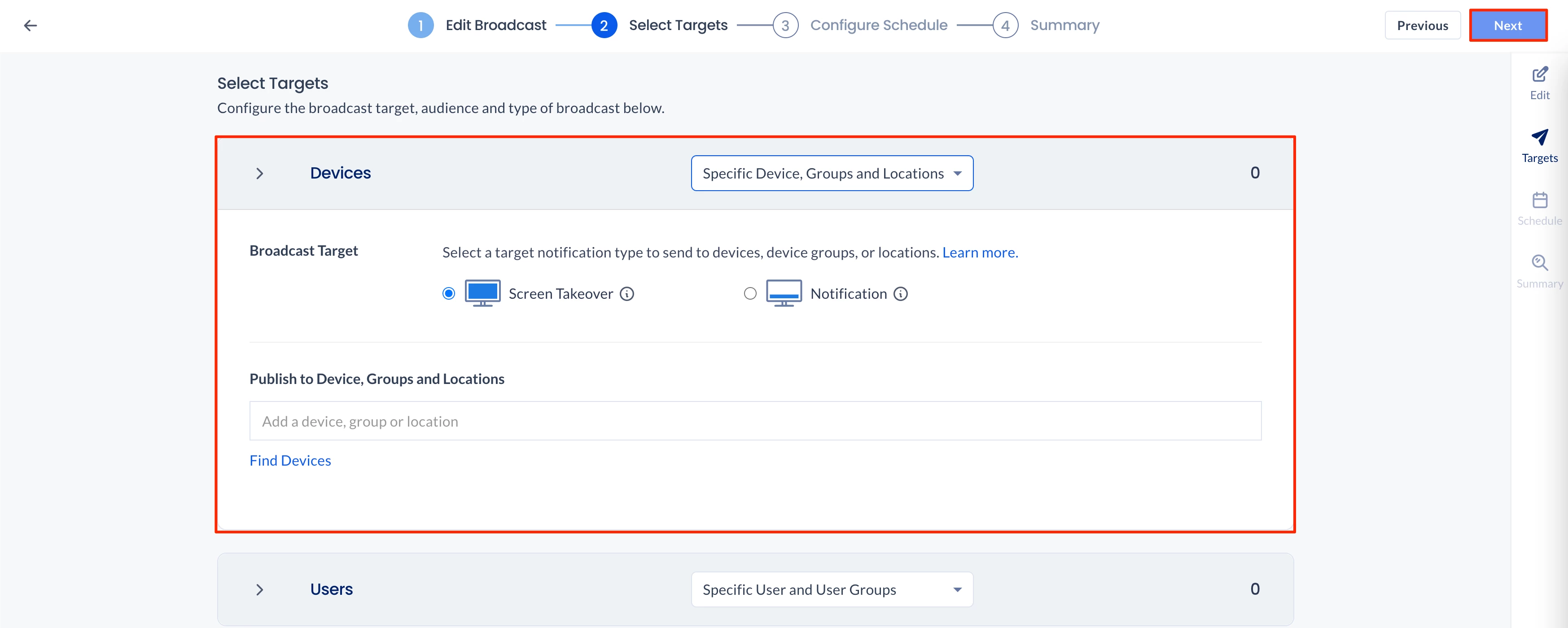 - Specific Device, Groups, and Locations – Proceed to select and add the specific target device, device groups, or device locations.