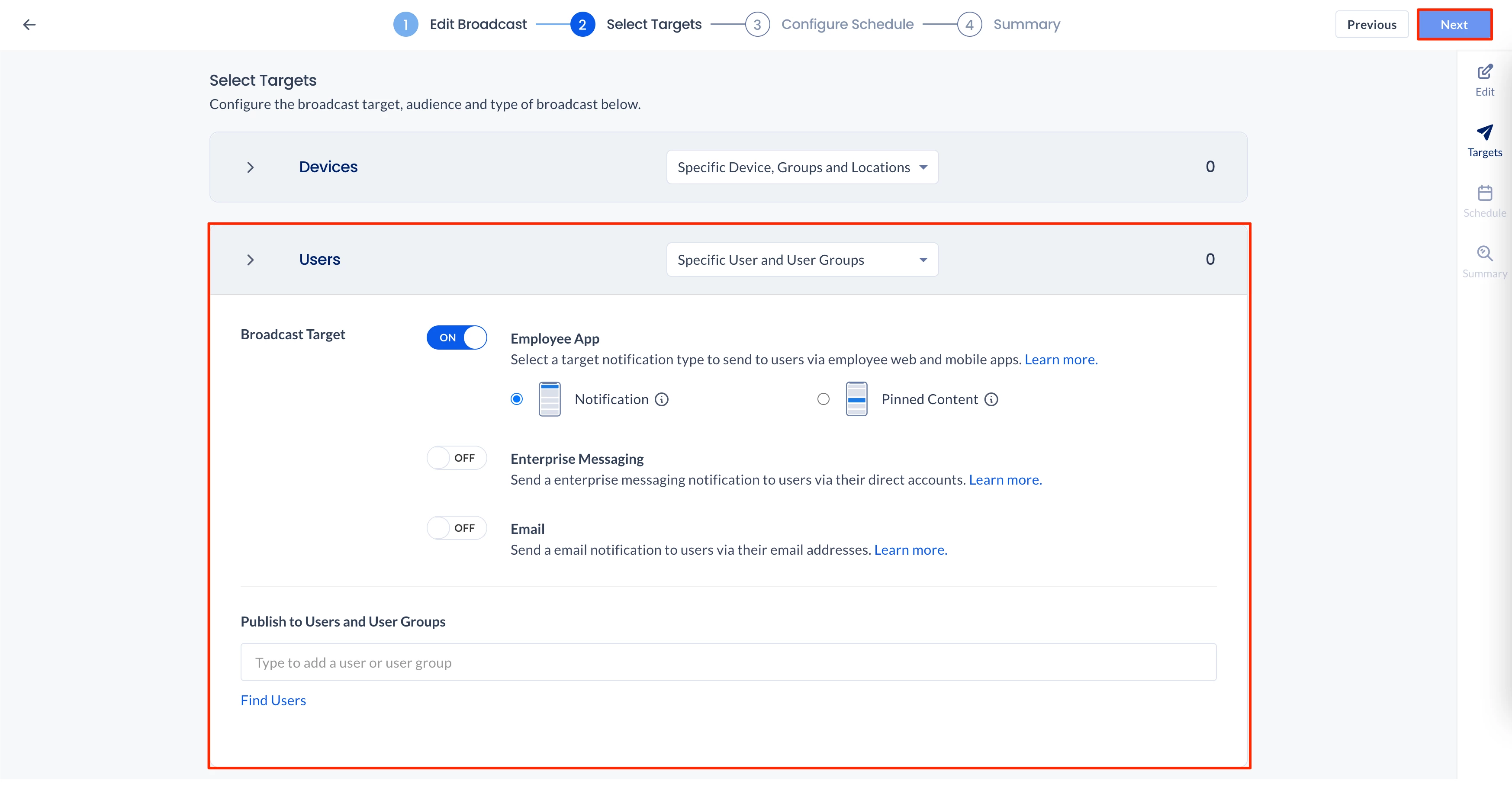 - In the Select Targets section, configure the broadcasts target, audience, and type of broadcast below: