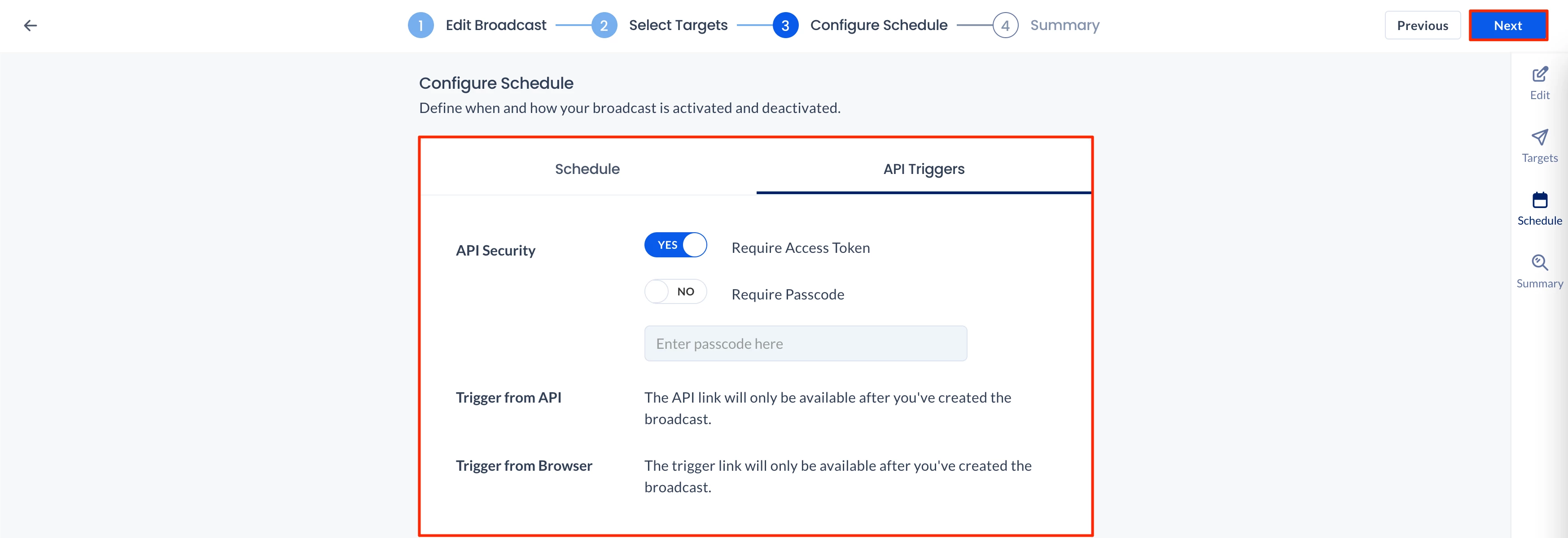- In the Configure Schedule section, configure how the broadcast is activated or deactivated (triggered):