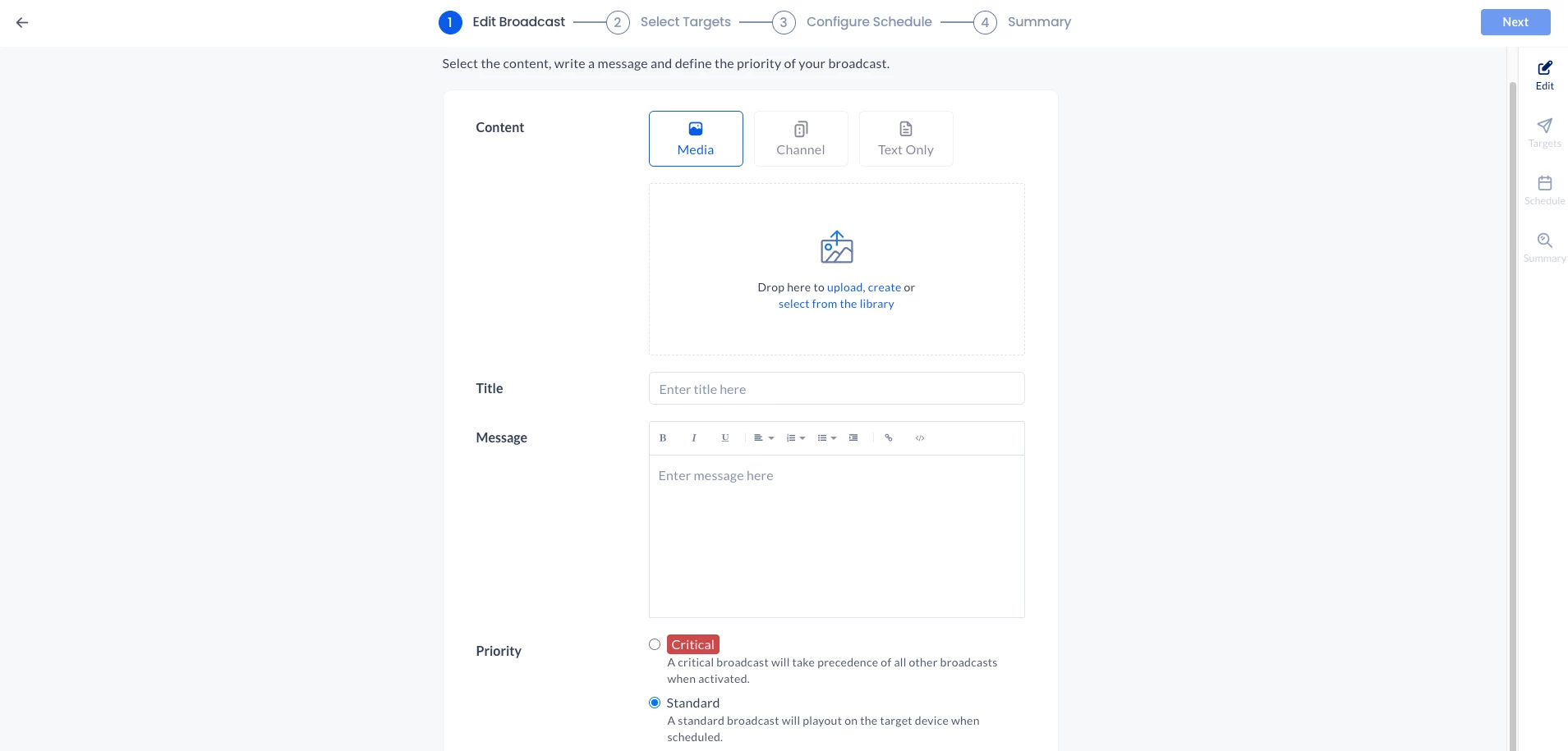 - Standard – A standard broadcast will play out on the target device when scheduled.