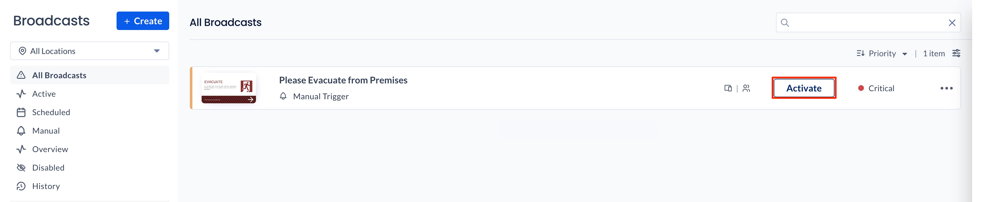 - Select the desired broadcast from the dashboard, and click Activate or Deactivate.