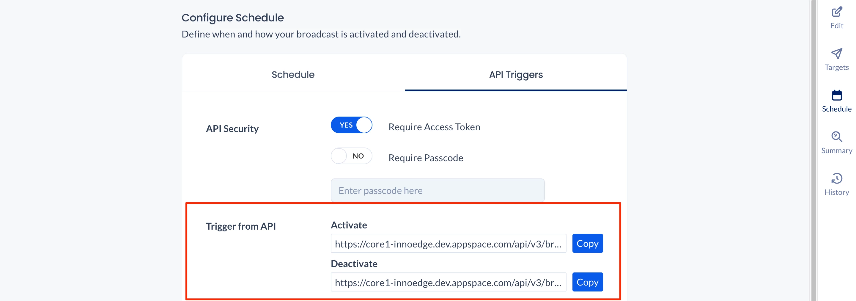 - Click the API Triggers tab, and copy both the Activate and Deactivate API URL triggers, which can be used by an external system to activate or deactivate broadcasts. (Request Method: POST)