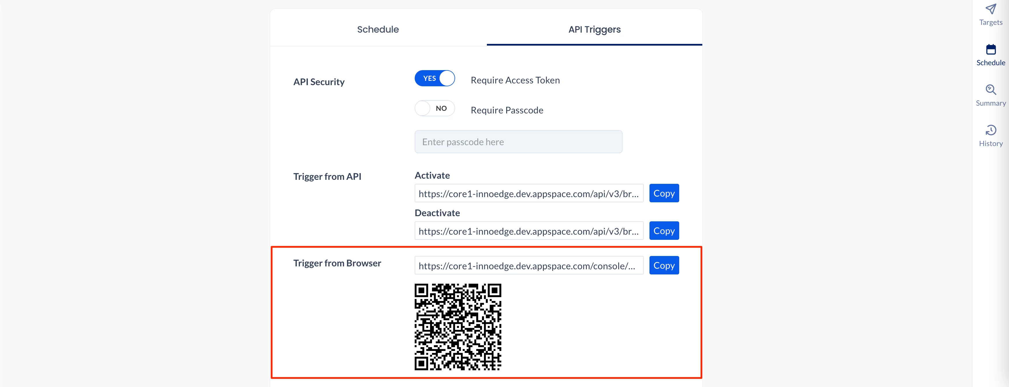 - Click the API Triggers tab, and copy and paste the Trigger from Browser URL onto a web browser, or scan the QR code to launch a web browser. (Request Method: POST)
