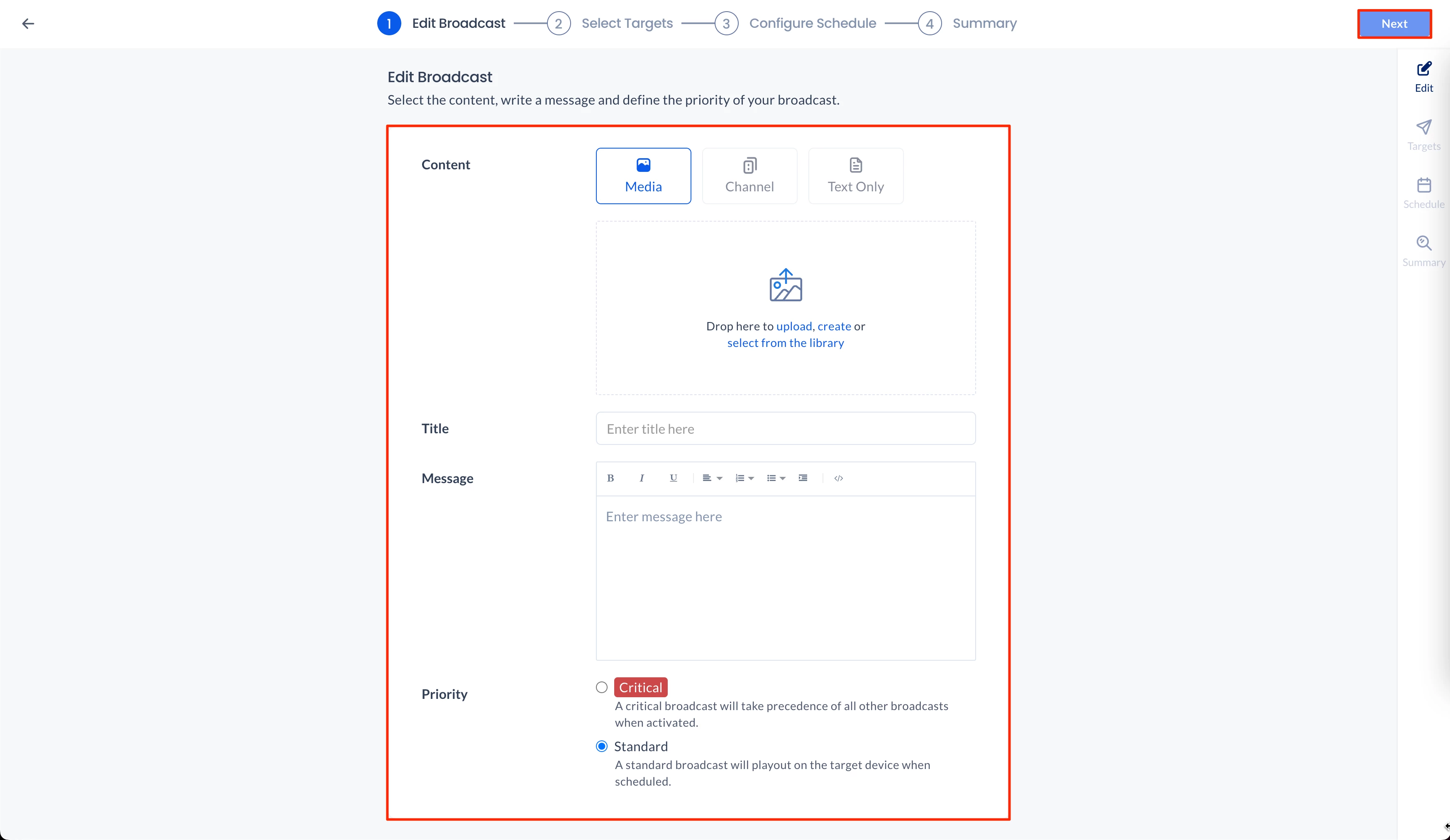 - Standard – A standard broadcast will play out on the target device when scheduled.