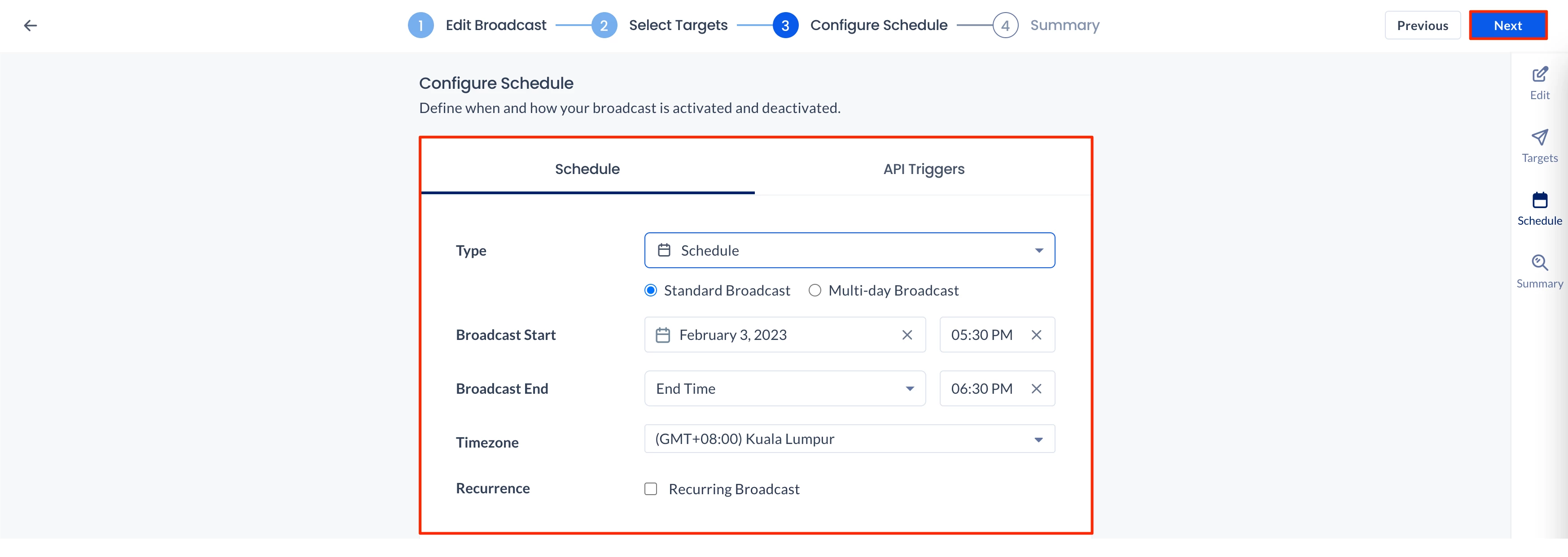 - In the Configure Schedule section, configure how the broadcast is activated or deactivated (triggered) as per the existing alert template: