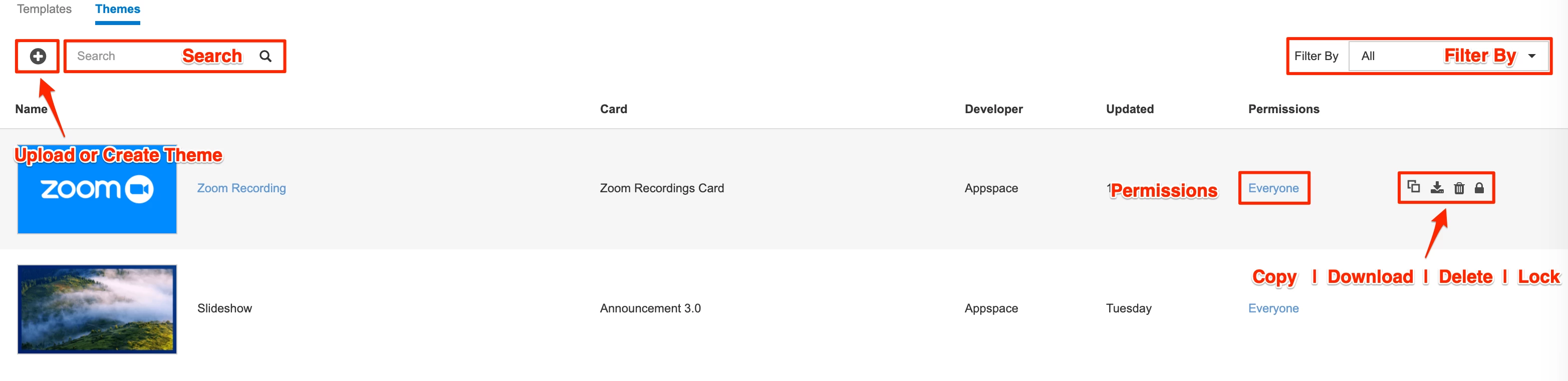 The Themes dashboard (tab) provides Administrators with a list of installed card themes, and the necessary functions to manage these card themes in the Appspace console.