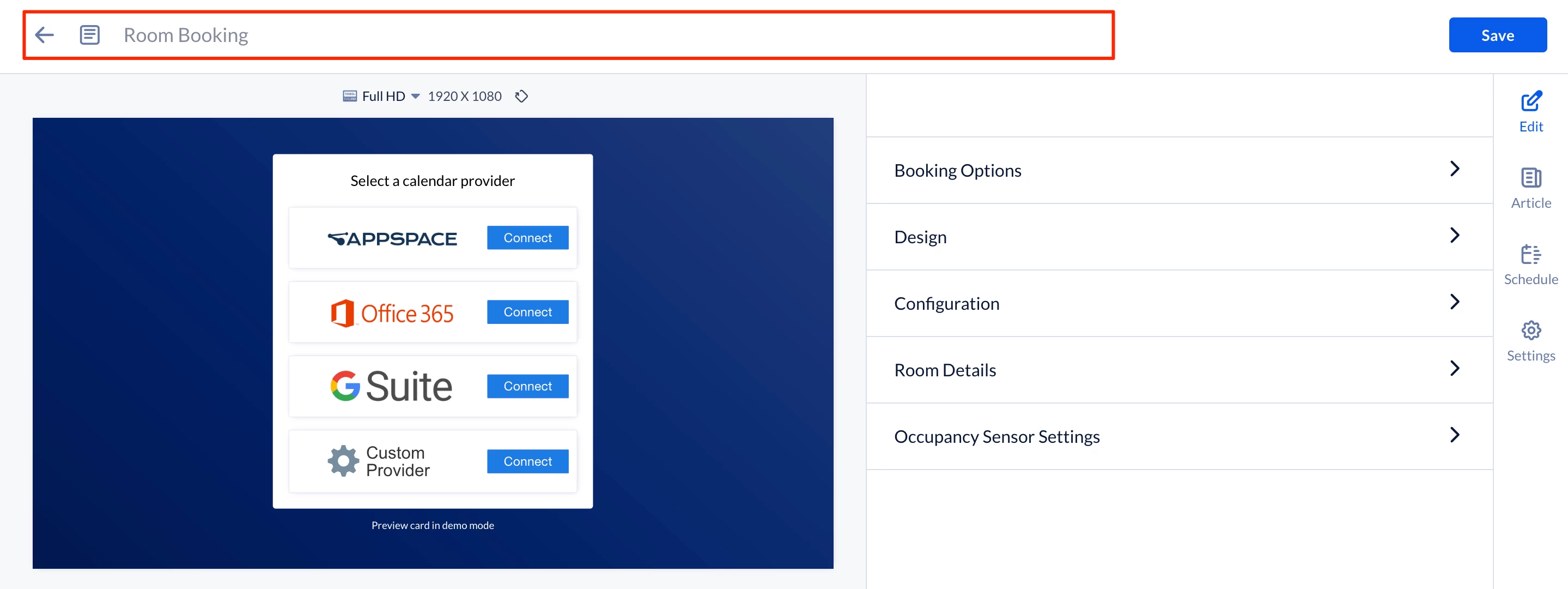 This article provides the instructions to create and configure a Room Booking card, ideal for single room scheduling via touch screen panels placed outside or in conference rooms.