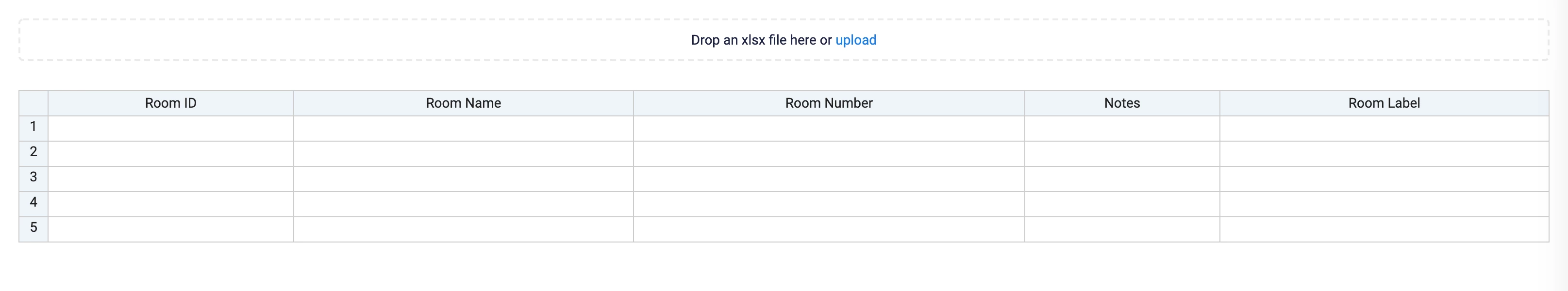 - Upload a .xlsx file containing the room details. The table headers in the file must correspond to the headers in the card editor table shown, i.e.