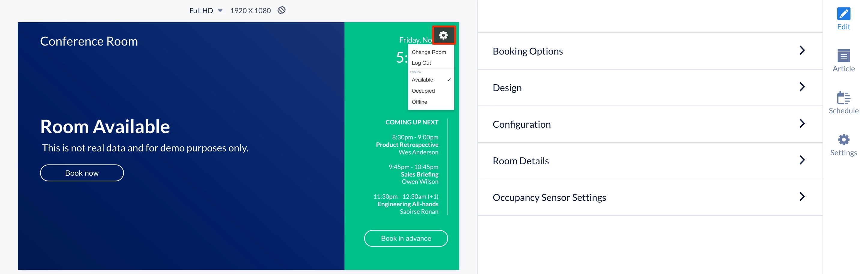- The Card preview section on the right displays how the Room Booking card looks like when displayed. You may click the Gear icon to preview the Occupied or Offline status of the card, Change Room, or Log Out from the authenticated card.